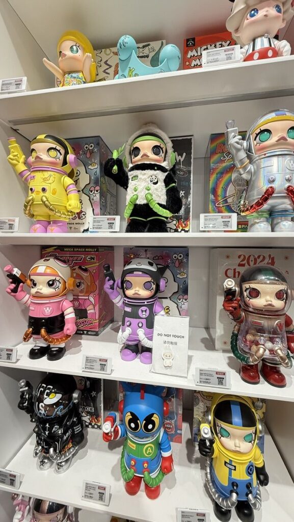 ‘Molly’는 2016년 홍콩 아티스트 케니 왕(Kenny Wong)과 협업으로 탄생했으며, 출시 직후 중국 젊은 여성층의 폭발적인 반응을 얻었다. 무표정한 얼굴의 Molly는 ‘쿨함’과 ‘감정적 거리두기’를 상징하며, Z세대 정서를 대변했다. 이어 등장한 ‘Labubu’ 시리즈는 유럽과 동남아시아에서도 컬트적 인기를 얻으며, 중고 시장에서 수십 배의 가격으로 거래되었다.