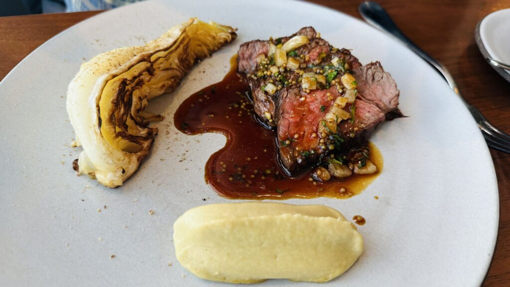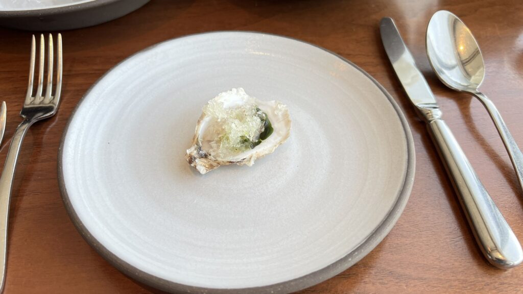 특히 전채로 등장한 ‘Oysters Manhatta’는 유니(성게알)와 샴페인 사바용(sabayon)을 얹어낸 구성으로, 입안 가득 터지는 해산물의 감칠맛과 동시에 맑은 국물 요리를 연상케 하는 여운을 남긴다. 메인 요리 중 단연 인상 깊은 것은 드라이 에이징을 거친 오리 요리다. 겉은 바삭하게 구워졌고 속은 육즙을 머금은 채 부드러웠으며, 곁들여 나온 퓨레에는 야마토 고구마와 감이 사용돼 달콤하고 고소한 맛이 입안을 감쌌다. 이는 명절에 먹던 ‘한식 제철 요리’의 감각을 고급스럽게 재해석한 인상을 줬다.